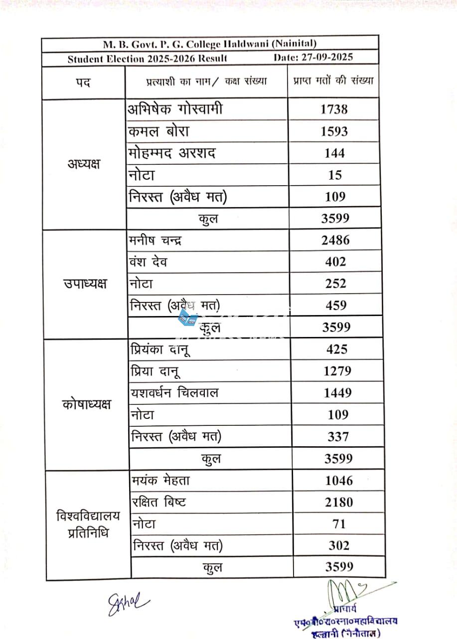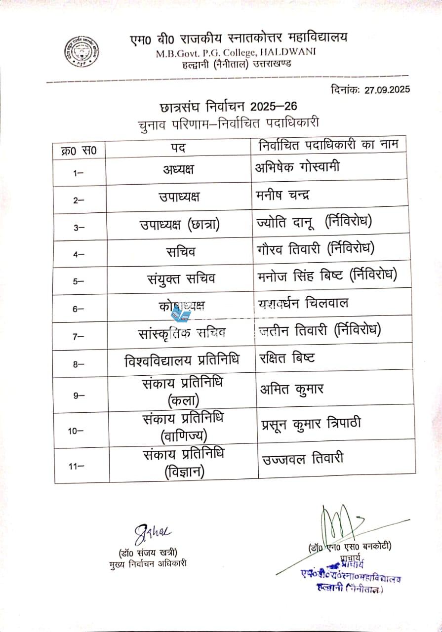 हल्द्वानी। एम.बी.पी.जी. कॉलेज हल्द्वानी में शनिवार को संपन्न हुए छात्रसंघ चुनाव 2025-26 में ABVP के अभिषेक गोस्वामी ने अध्यक्ष पद पर कब्जा किया। उपाध्यक्ष मनीष चन्द्र निर्वाचित हुए, जबकि अन्य पदों पर भी छात्रों ने निर्णायक चुनावी सहभागिता दिखाई। कुल 3599 मतदाता अपने मताधिकार का प्रयोग करने पहुँचे। चुनाव परिणामों के अनुसार, अध्यक्ष पद पर अभिषेक गोस्वामी ने 1738 मत हासिल कर कमल बोरा और मोहम्मद अरशद को पराजित किया। उपाध्यक्ष पद पर मनीष चन्द्र 2486 मत लेकर विजयी रहे। कोषाध्यक्ष के रूप में यशवर्धन चिलवाल, विश्वविद्यालय प्रतिनिधि के रूप में रक्षित बिष्ट निर्वाचित हुए।