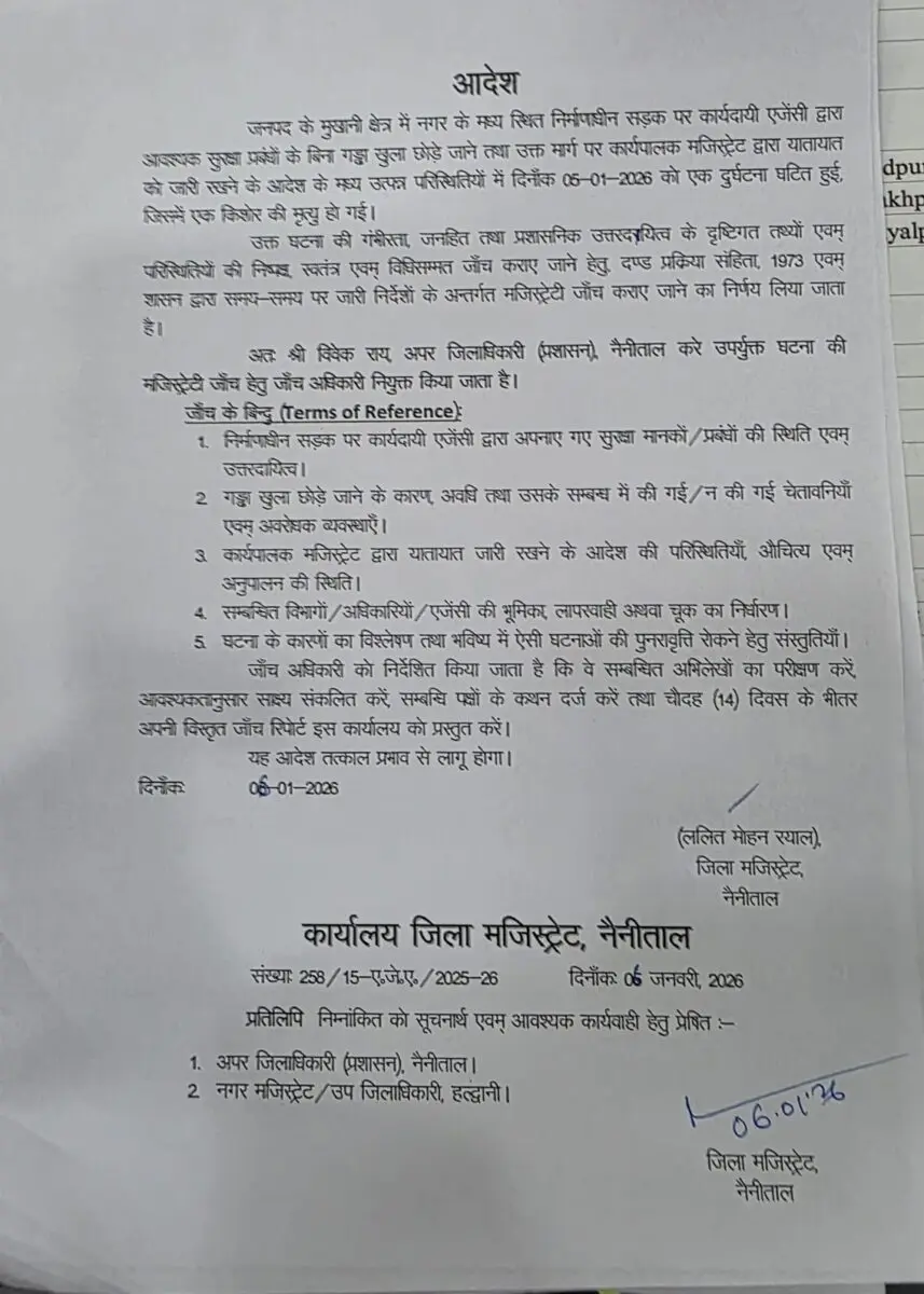 हल्द्वानी। मुखानी क्षेत्र में निर्माणाधीन सड़क पर खुले गड्ढे के कारण हुए दर्दनाक हादसे के बाद प्रशासन ने सख्त रुख अपनाते हुए पूरे प्रकरण की निष्पक्ष और स्वतंत्र मजिस्ट्रेटी जांच के आदेश जारी कर दिए हैं। इस हादसे में एक किशोर की मौत हो गई थी, जिसने निर्माण कार्यों में लापरवाही और सुरक्षा इंतजामों पर गंभीर सवाल खड़े कर दिए थे। जिला मजिस्ट्रेट नैनीताल ललित मोहन स्याल ने मामले की गंभीरता, जनहित और प्रशासनिक उत्तरदायित्व को देखते हुए मजिस्ट्रेटी जांच कराने का निर्णय लिया है। आदेश के अनुसार, अपर जिलाधिकारी (प्रशासन) विवेक राय को इस प्रकरण का जांच अधिकारी नियुक्त किया गया है। जांच में यह स्पष्ट किया जाएगा कि निर्माणाधीन सड़क पर कार्यदायी एजेंसी द्वारा सुरक्षा मानकों का पालन किया गया या नहीं, गड्ढा किस कारण और कितने समय तक खुला छोड़ा गया तथा उस दौरान चेतावनी संकेत और अवरोधक क्यों नहीं लगाए गए।