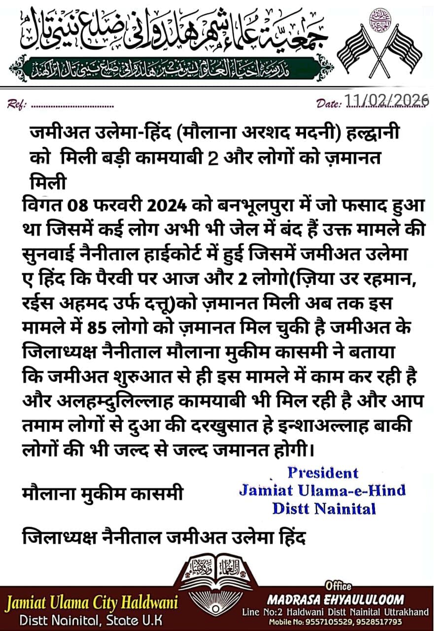हल्द्वानी। 8 फरवरी 2024 को बनभूलपुरा में हुए चर्चित फसाद मामले में नैनीताल हाईकोर्ट से तीन और आरोपियों को जमानत मिलने की खबर सामने आई है। जमीअत उलेमा-ए-हिंद (मौलाना अरशद मदनी) की ओर से की जा रही पैरवी के तहत ज़िया उर रहमान और रईस अहमद उर्फ दत्तू को न्यायालय से राहत मिली है। इसके साथ ही इस मामले में अब तक कुल 85 लोगों को जमानत मिल चुकी है। जमीअत उलेमा-ए-हिंद के जिलाध्यक्ष नैनीताल मौलाना मुकीम कासमी ने बताया कि संगठन शुरुआत से ही इस प्रकरण में कानूनी सहायता उपलब्ध करा रहा है और लगातार अदालत में पैरवी कर रहा है।