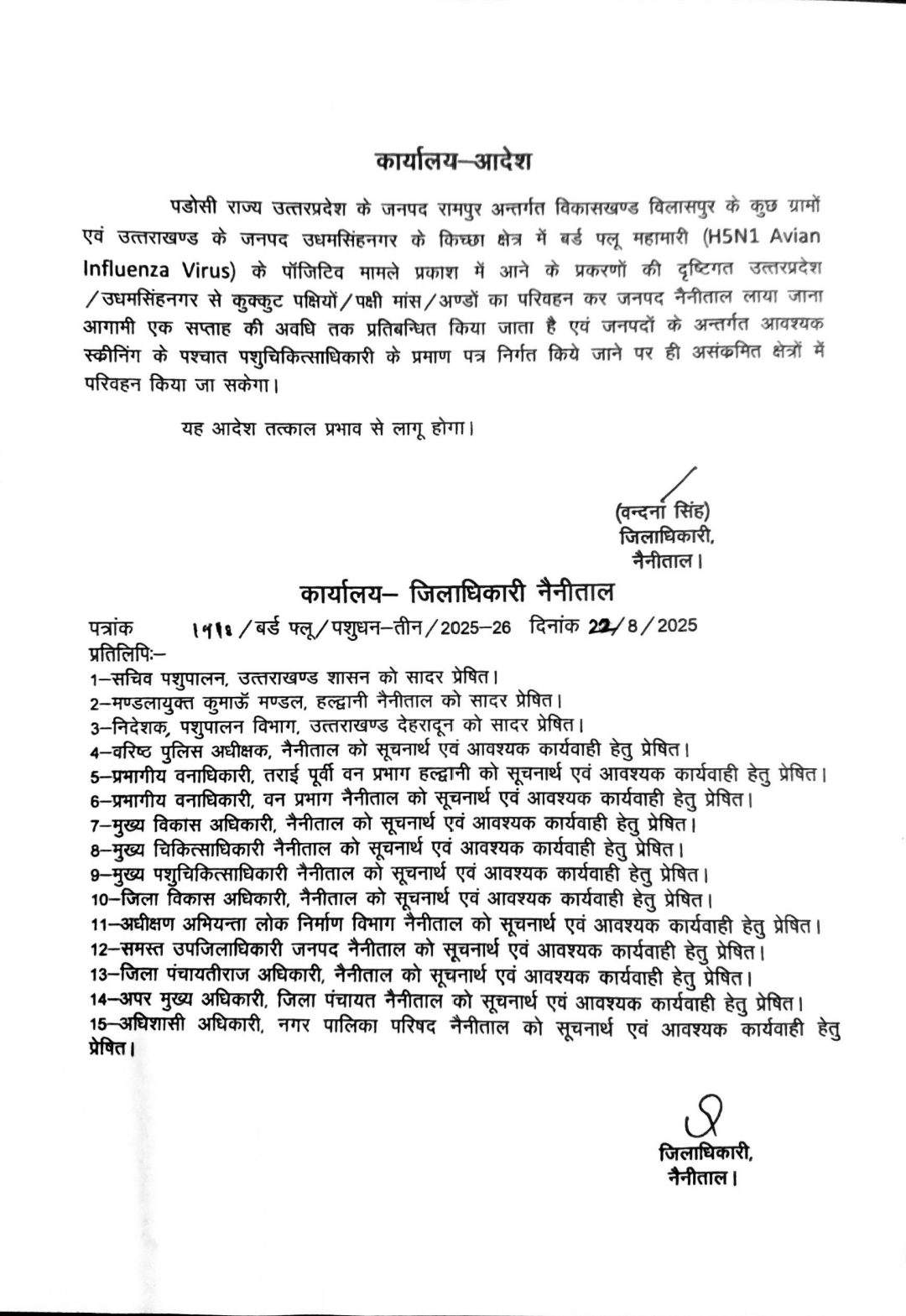 नैनीताल। उत्तर प्रदेश के रामपुर जिले के बिलासपुर ब्लॉक और उत्तराखंड के ऊधम सिंह नगर जिले के किच्छा क्षेत्र में बर्ड फ्लू (H5N1 एवियन इन्फ्लूएंजा वायरस) के पॉजिटिव मामले सामने आने के बाद नैनीताल जिले में सतर्कता बढ़ा दी गई है। जिलाधिकारी वंदना सिंह ने एहतियात के तौर पर बड़ा फैसला लेते हुए पड़ोसी जिलों से कुक्कुट पक्षियों, पक्षी मांस और अंडों के परिवहन पर तत्काल प्रभाव से एक सप्ताह के लिए पूर्ण प्रतिबंध लगा दिया है।