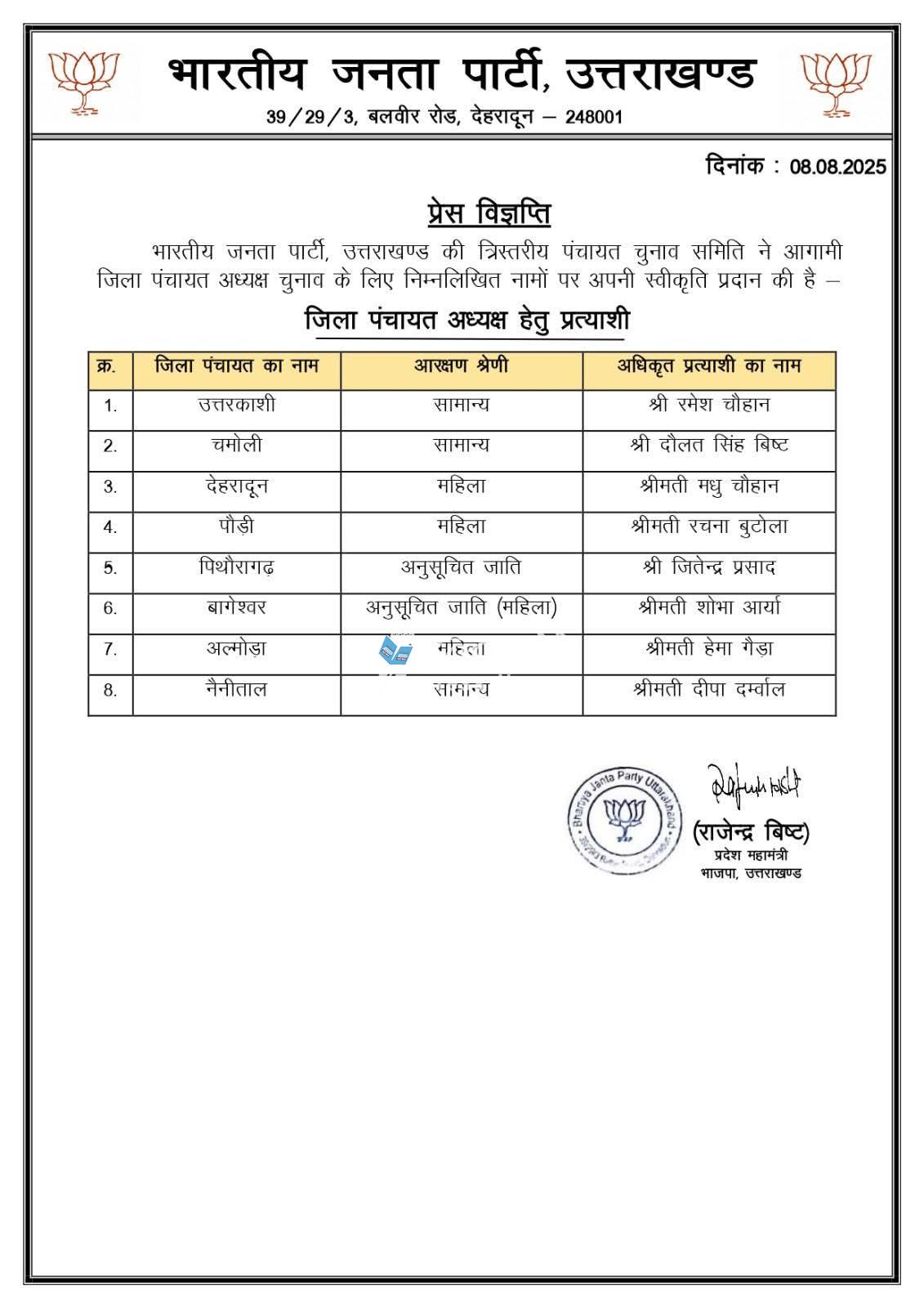 देहरादून। उत्तराखण्ड में त्रिस्तरीय पंचायत चुनावों की सरगर्मियों के बीच भारतीय जनता पार्टी ने जिला पंचायत अध्यक्ष पद के लिए अपने अधिकृत प्रत्याशियों की घोषणा कर दी है। पार्टी के प्रदेश कार्यालय से जारी प्रेस विज्ञप्ति के अनुसार, भाजपा की त्रिस्तरीय पंचायत चुनाव समिति ने आठ जिलों में प्रत्याशियों के नामों को स्वीकृति प्रदान की है। इनमें उत्तरकाशी से रमेश चौहान, चमोली से दौलत सिंह बिष्ट, देहरादून से मधु चौहान, पौड़ी से रचना बुटोला, पिथौरागढ़ से जितेन्द्र प्रसाद, बागेश्वर से शोभा आर्या, अल्मोड़ा से हेमा गैड़ा और नैनीताल से दीपा दरमवाल को अधिकृत प्रत्याशी बनाया गया है।