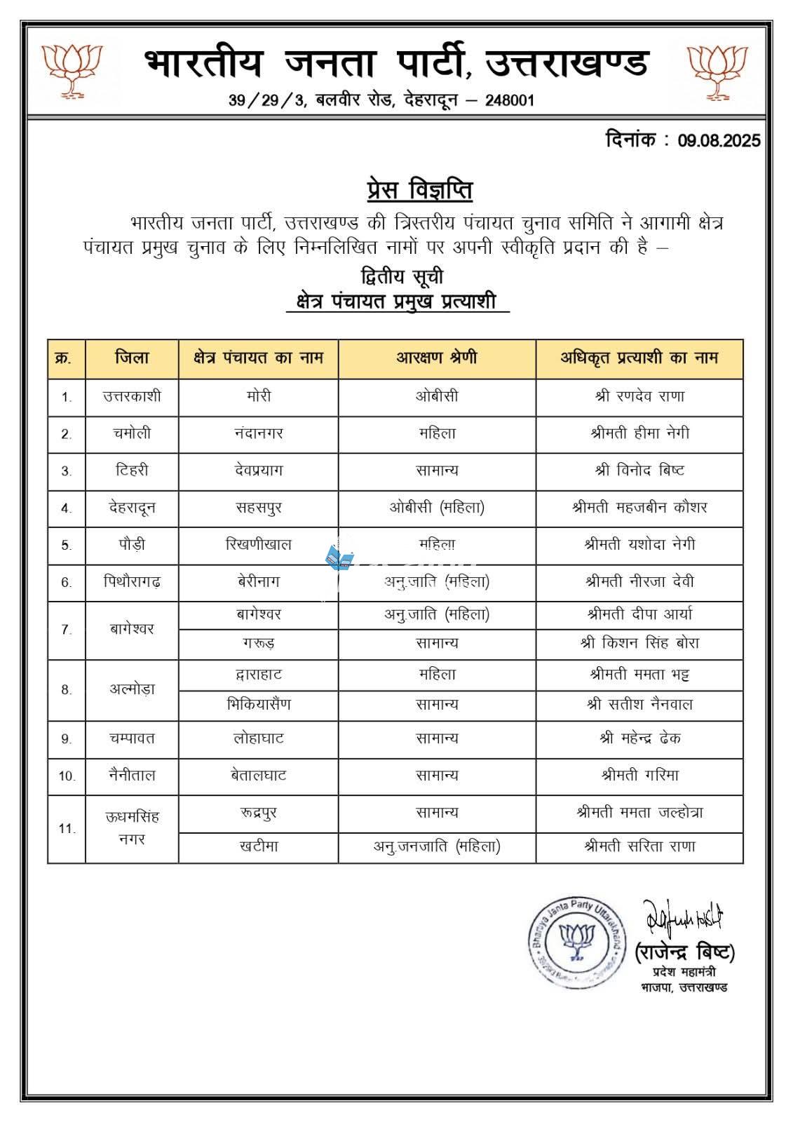 देहरादून। भारतीय जनता पार्टी, उत्तराखंड की त्रिस्तरीय पंचायत चुनाव समिति ने आगामी क्षेत्र पंचायत प्रमुख चुनाव के लिए अपनी दूसरी सूची जारी कर दी है। इस सूची में प्रदेश के विभिन्न जिलों से 11 अधिकृत प्रत्याशियों के नाम शामिल हैं। पार्टी की ओर से यह सूची प्रदेश अध्यक्ष महेंद्र भट्ट के निर्देश पर जारी की गई है, जिसमें ओबीसी, महिला, अनुसूचित जाति और अनुसूचित जनजाति सहित विभिन्न आरक्षण श्रेणियों के प्रत्याशियों को स्थान दिया गया है।