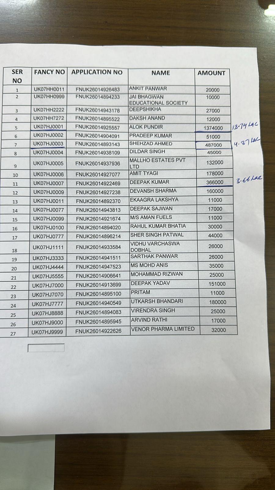 देहरादून। देहरादून परिवहन संभाग में वाहनों के पंजीकरण के लिए जारी नई सीरीज UK 07 HJ के फैंसी नंबरों को लेकर ऑनलाइन ऑक्शन में जबरदस्त प्रतिस्पर्धा देखने को मिली। सबसे चर्चित नंबर UK 07 HJ 0001 को आलोक पुंडीर ने 13 लाख 74 हजार रुपये की ऊंची बोली लगाकर हासिल किया, जिससे यह ऑक्शन खासा सुर्खियों में रहा।ऑक्शन में अन्य फैंसी नंबरों के लिए भी मोटी रकम लगाई गई। UK 07 HJ 0003 नंबर शहजाद अहमद ने 4 लाख 87 हजार रुपये में खरीदा, जबकि UK 07 HJ 0007 नंबर दीपक कुमार के नाम 3 लाख 66 हजार रुपये में गया।