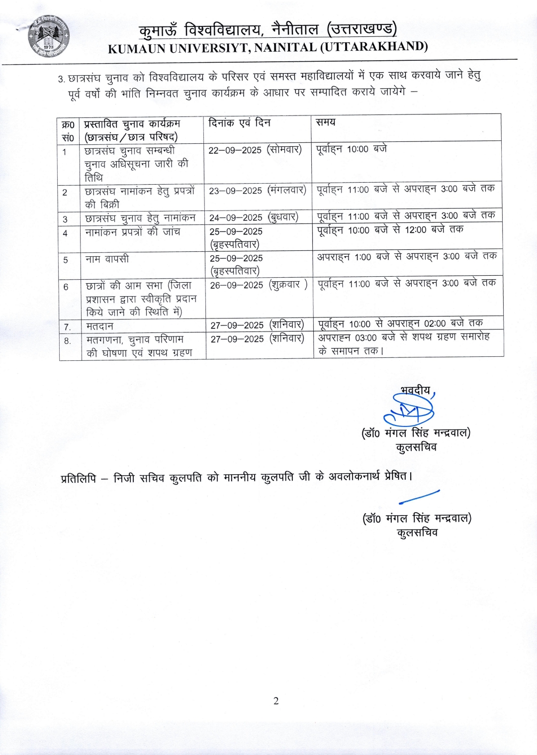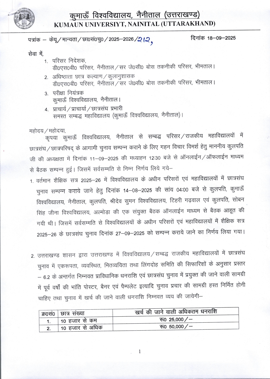 नैनीताल। कुमाऊँ विश्वविद्यालय, नैनीताल से सम्बद्ध सभी परिसरों और राजकीय महाविद्यालयों में छात्रसंघ चुनाव की तैयारियां तेज हो गई हैं। विश्वविद्यालय प्रशासन ने चुनाव कार्यक्रम की अधिसूचना जारी कर दी है। कुलपति की अध्यक्षता में हुई महत्वपूर्ण बैठक में यह तय किया गया कि शैक्षिक सत्र 2025-26 के छात्रसंघ चुनाव 27 सितम्बर 2025 (शनिवार) को एक साथ सम्पन्न कराए जाएंगे। इस फैसले के साथ ही छात्र राजनीति में सरगर्मी तेज हो गई है और परिसर से लेकर कॉलेजों तक छात्र संगठनों ने रणनीति बनानी शुरू कर दी है। बैठक में यह भी स्पष्ट किया गया कि चुनाव पूरी पारदर्शिता और लिंगदोह समिति की सिफारिशों के अनुरूप कराए जाएंगे। चुनाव प्रचार के दौरान केवल हस्तनिर्मित पोस्टर, बैनर और पैम्पलेट की ही अनुमति होगी। वहीं चुनावी खर्च की सीमा भी निर्धारित की गई है, 10 हजार से कम छात्र संख्या वाले कॉलेजों में अधिकतम ₹25,000 और 10 हजार से अधिक छात्र संख्या वाले कॉलेजों में अधिकतम ₹50,000 तक खर्च किया जा सकेगा।