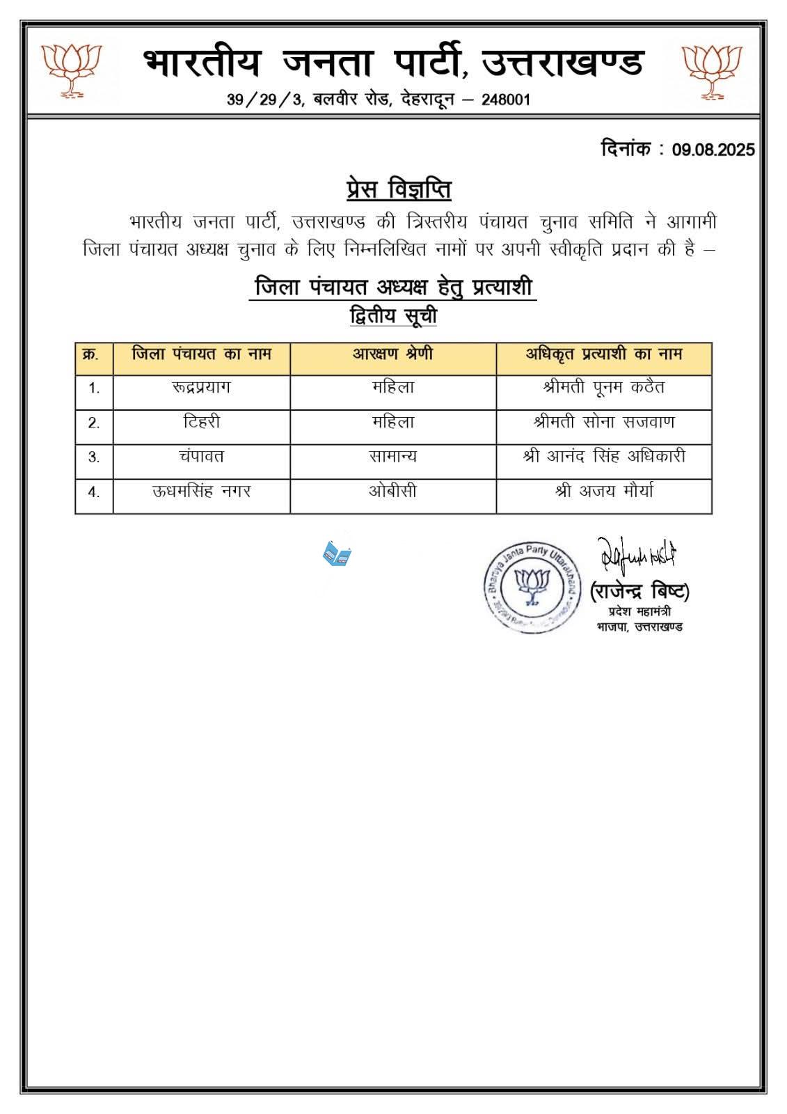 देहरादून। उत्तराखण्ड में होने वाले आगामी जिला पंचायत अध्यक्ष चुनाव को लेकर भारतीय जनता पार्टी ने अपनी दूसरी सूची जारी कर दी है। पार्टी की त्रिस्तरीय पंचायत चुनाव समिति ने चार जिलों के प्रत्याशियों के नामों को अंतिम स्वीकृति प्रदान की है। घोषित सूची के अनुसार रुद्रप्रयाग से महिला आरक्षण श्रेणी में पूनम कठैत, टिहरी से महिला श्रेणी में सोना सजवाण, चंपावत से सामान्य श्रेणी में आनंद सिंह अधिकारी और ऊधमसिंह नगर से ओबीसी श्रेणी में अजय मौर्या को अधिकृत प्रत्याशी बनाया गया है।