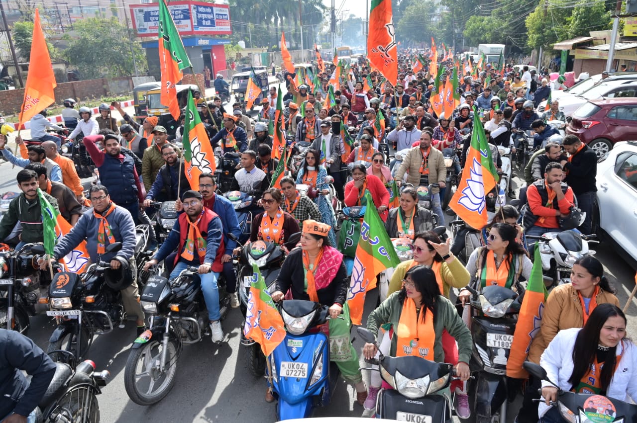 हल्द्वानी। नगर निगम चुनाव की सरगर्मियां अपने चरम पर पहुंच चुकी हैं। मंगलवार को हल्द्वानी की सड़कों पर भाजपा और कांग्रेस ने अपनी ताकत का जबरदस्त प्रदर्शन किया। भाजपा ने मेयर प्रत्याशी गजराज सिंह बिष्ट के समर्थन में बाइक रैली निकाली, तो वहीं कांग्रेस ने मेयर प्रत्याशी ललित जोशी के पक्ष में विशाल जनसभा और रैली का आयोजन कर हल्द्वानी को चुनावी रंग में रंग दिया। दोनों पार्टियों के इन शक्ति प्रदर्शनों ने नगर में माहौल गर्मा दिया है। भाजपा के मेयर प्रत्याशी गजराज सिंह बिष्ट के समर्थन में भारतीय जनता युवा मोर्चा के प्रदेश अध्यक्ष शशांक रावत के नेतृत्व में एमबी इंटर कॉलेज से एक भव्य बाइक रैली निकाली गई। भारी संख्या में युवा कार्यकर्ताओं ने रैली में भाग लेकर भाजपा के समर्थन में अपना जोश और उत्साह दिखाया। रैली पूरे हल्द्वानी नगर निगम क्षेत्र में घूमी, जिसमें गजराज सिंह बिष्ट के साथ सांसद अजय भट्ट, निवर्तमान मेयर जोगेंद्र रौतेला और कई प्रमुख नेता चुनावी रथ पर मौजूद रहे। रैली को संबोधित करते हुए सांसद अजय भट्ट ने कहा, “युवाओं का यह उत्साह साबित करता है कि 23 जनवरी को हल्द्वानी में कमल खिलेगा।” मेयर प्रत्याशी गजराज सिंह बिष्ट ने कांग्रेस पर निशाना साधते हुए कहा कि उनके विरोधी फूट डालो और राज करो की राजनीति कर रहे हैं, लेकिन भाजपा का उद्देश्य समाज को एकजुट करना और सनातन धर्म के मूल्यों को बनाए रखना है।