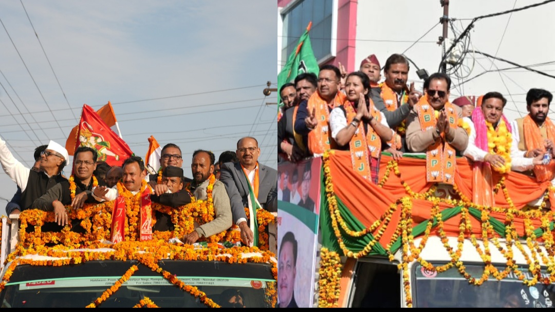 हल्द्वानी। नगर निगम चुनाव की सरगर्मियां अपने चरम पर पहुंच चुकी हैं। मंगलवार को हल्द्वानी की सड़कों पर भाजपा और कांग्रेस ने अपनी ताकत का जबरदस्त प्रदर्शन किया। भाजपा ने मेयर प्रत्याशी गजराज सिंह बिष्ट के समर्थन में बाइक रैली निकाली, तो वहीं कांग्रेस ने मेयर प्रत्याशी ललित जोशी के पक्ष में विशाल जनसभा और रैली का आयोजन कर हल्द्वानी को चुनावी रंग में रंग दिया। दोनों पार्टियों के इन शक्ति प्रदर्शनों ने नगर में माहौल गर्मा दिया है। भाजपा के मेयर प्रत्याशी गजराज सिंह बिष्ट के समर्थन में भारतीय जनता युवा मोर्चा के प्रदेश अध्यक्ष शशांक रावत के नेतृत्व में एमबी इंटर कॉलेज से एक भव्य बाइक रैली निकाली गई। भारी संख्या में युवा कार्यकर्ताओं ने रैली में भाग लेकर भाजपा के समर्थन में अपना जोश और उत्साह दिखाया। रैली पूरे हल्द्वानी नगर निगम क्षेत्र में घूमी, जिसमें गजराज सिंह बिष्ट के साथ सांसद अजय भट्ट, निवर्तमान मेयर जोगेंद्र रौतेला और कई प्रमुख नेता चुनावी रथ पर मौजूद रहे। रैली को संबोधित करते हुए सांसद अजय भट्ट ने कहा, “युवाओं का यह उत्साह साबित करता है कि 23 जनवरी को हल्द्वानी में कमल खिलेगा।” मेयर प्रत्याशी गजराज सिंह बिष्ट ने कांग्रेस पर निशाना साधते हुए कहा कि उनके विरोधी फूट डालो और राज करो की राजनीति कर रहे हैं, लेकिन भाजपा का उद्देश्य समाज को एकजुट करना और सनातन धर्म के मूल्यों को बनाए रखना है।