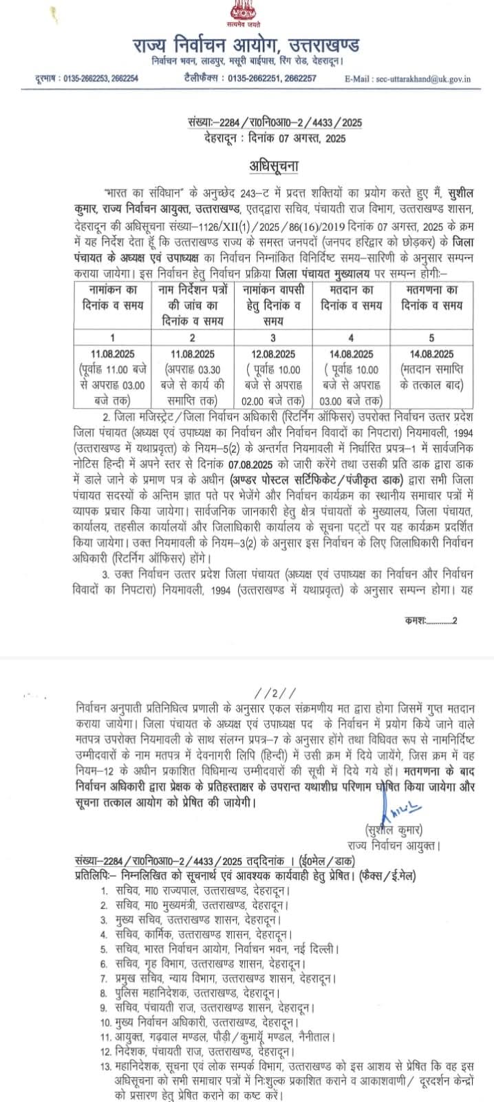 देहरादून। उत्तराखंड राज्य निर्वाचन आयोग ने प्रदेश के सभी जनपदों (हरिद्वार को छोड़कर) में जिला पंचायत अध्यक्ष एवं उपाध्यक्ष पद के चुनाव की तिथियों की घोषणा कर दी है। आयोग ने इसके लिए विस्तृत समय-सारिणी जारी करते हुए सभी जिलाधिकारियों को निर्वाचन अधिकारी के रूप में जिम्मेदारी सौंपी है। यह चुनाव उत्तर प्रदेश जिला पंचायत (अध्यक्ष एवं उपाध्यक्ष का निर्वाचन और निर्वाचन विवादों का निपटारा) नियमावली, 1994 के तहत अनुपाती प्रतिनिधित्व प्रणाली के अंतर्गत एकल संक्रमणीय मत पद्धति से गुप्त मतदान द्वारा संपन्न कराया जाएगा। जारी अधिसूचना के अनुसार, नामांकन प्रक्रिया 11 अगस्त को सुबह 11 बजे से दोपहर 3 बजे तक पूरी होगी, उसी दिन 3:30 बजे से नामांकन पत्रों की जांच की जाएगी।