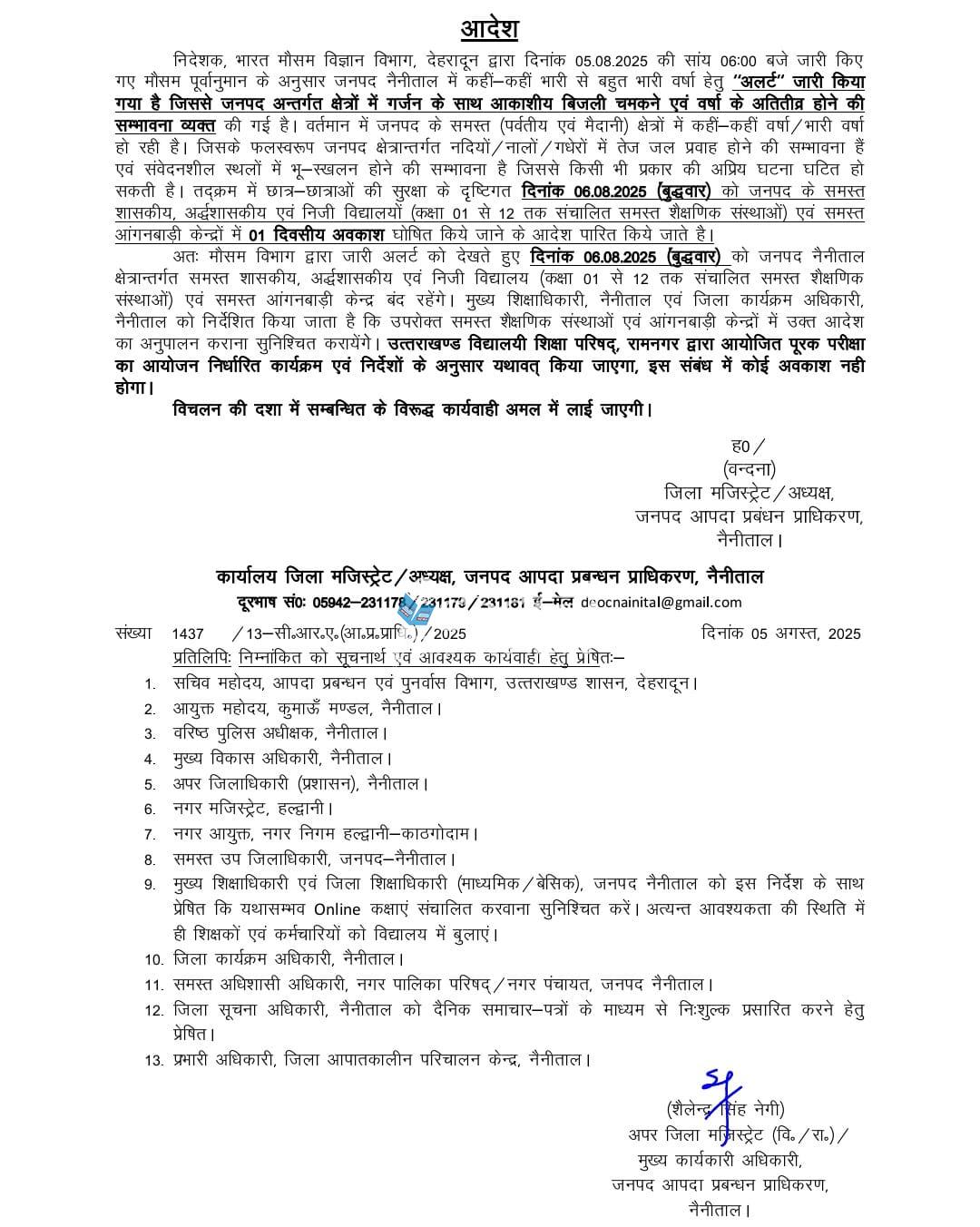 नैनीताल। उत्तराखंड में जारी भारी बारिश के चलते नैनीताल जिला प्रशासन ने एक बड़ा निर्णय लेते हुए जिले के सभी सरकारी, गैर-सरकारी, निजी विद्यालयों (कक्षा 1 से 12 तक) एवं समस्त आंगनबाड़ी केंद्रों में बुधवार 6 अगस्त को अवकाश घोषित कर दिया है। भारत मौसम विज्ञान विभाग द्वारा जारी रेड अलर्ट के मद्देनज़र यह फैसला लिया गया है, जिसमें 6 अगस्त को भारी से अत्यंत भारी बारिश की चेतावनी दी गई है। जिलाधिकारी वंदना ने कहा कि लगातार हो रही मूसलधार वर्षा और आगामी 24 घंटों में भूस्खलन, सड़क अवरोध, जलभराव, और नदी-नालों में तेज बहाव की आशंका को देखते हुए बच्चों की सुरक्षा सर्वोपरि है। ऐसे में ऐहतियातन समस्त शिक्षण संस्थानों को बंद रखने का निर्णय लिया गया है।