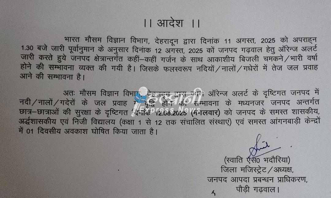 देहरादून/रुद्रपुर/पौड़ी। मौसम विभाग के पूर्वानुमान के बाद भारी बारिश और आकाशीय बिजली की आशंका को देखते हुए ऊधम सिंह नगर और पौड़ी गढ़वाल जिलों में कल 12 अगस्त 2025 सभी सरकारी, अर्द्धशासकीय और निजी विद्यालयों (कक्षा 1 से 12) तथा आंगनबाड़ी केंद्रों में अवकाश घोषित कर दिया गया है। ऊधम सिंह नगर में “रेड अलर्ट” और पौड़ी गढ़वाल में “ऑरेंज अलर्ट” जारी करते हुए प्रशासन ने नदियों-नालों में जलस्तर बढ़ने और भू-स्खलन की आशंका जताई है।