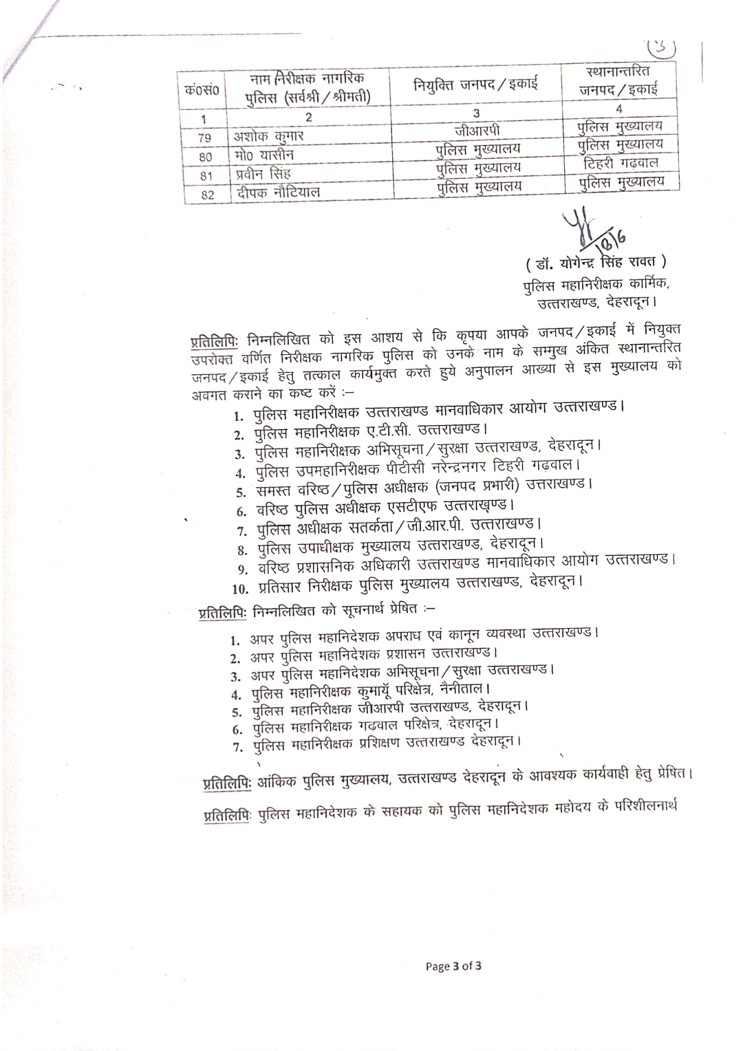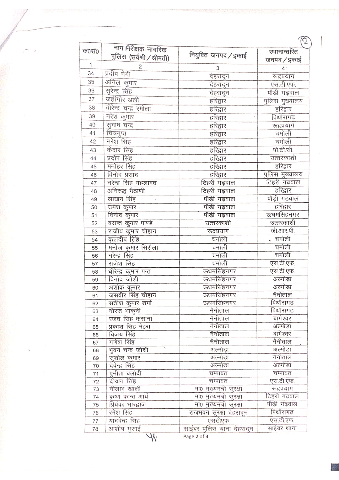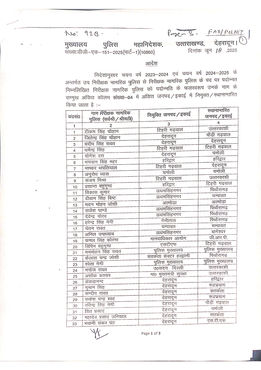देहरादून। उत्तराखंड पुलिस मुख्यालय ने पुलिस विभाग में एक महत्वपूर्ण प्रशासनिक बदलाव करते हुए 2023-24 और 2024-25 चयन वर्ष के अंतर्गत उप निरीक्षक नागरिक पुलिस के पद पर कार्यरत 33 अधिकारियों को निरीक्षक नागरिक पुलिस के पद पर पदोन्नत किया है। साथ ही उन्हें विभिन्न जनपदों और इकाइयों में नई नियुक्ति/स्थानांतरण आदेश जारी कर दिए गए हैं। इस संबंध में पुलिस महानिरीक्षक (कार्मिक) डॉ. योगेन्द्र सिंह रावत द्वारा हस्ताक्षरित आदेश जारी कर दिए गए हैं, जिसके अनुसार निरीक्षक पद पर पदोन्नति पाने वाले अधिकारियों को जनहित में नई जिम्मेदारियां सौंपी गई हैं।