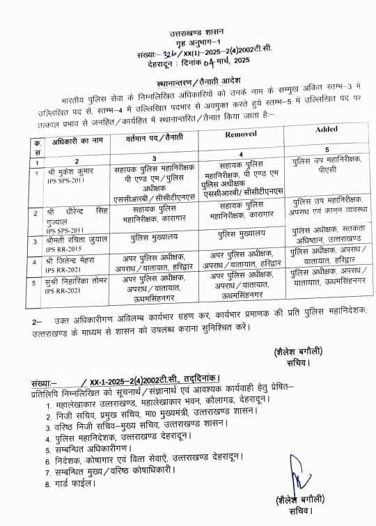 देहरादून। उत्तराखंड शासन ने मंगलवार को भारतीय पुलिस सेवा (IPS) के कई अधिकारियों के तबादले और नई तैनाती के आदेश जारी किए हैं। गृह विभाग की ओर से जारी आदेश के तहत पांच वरिष्ठ पुलिस अधिकारियों को तत्काल प्रभाव से नई जिम्मेदारियां दी गई हैं।