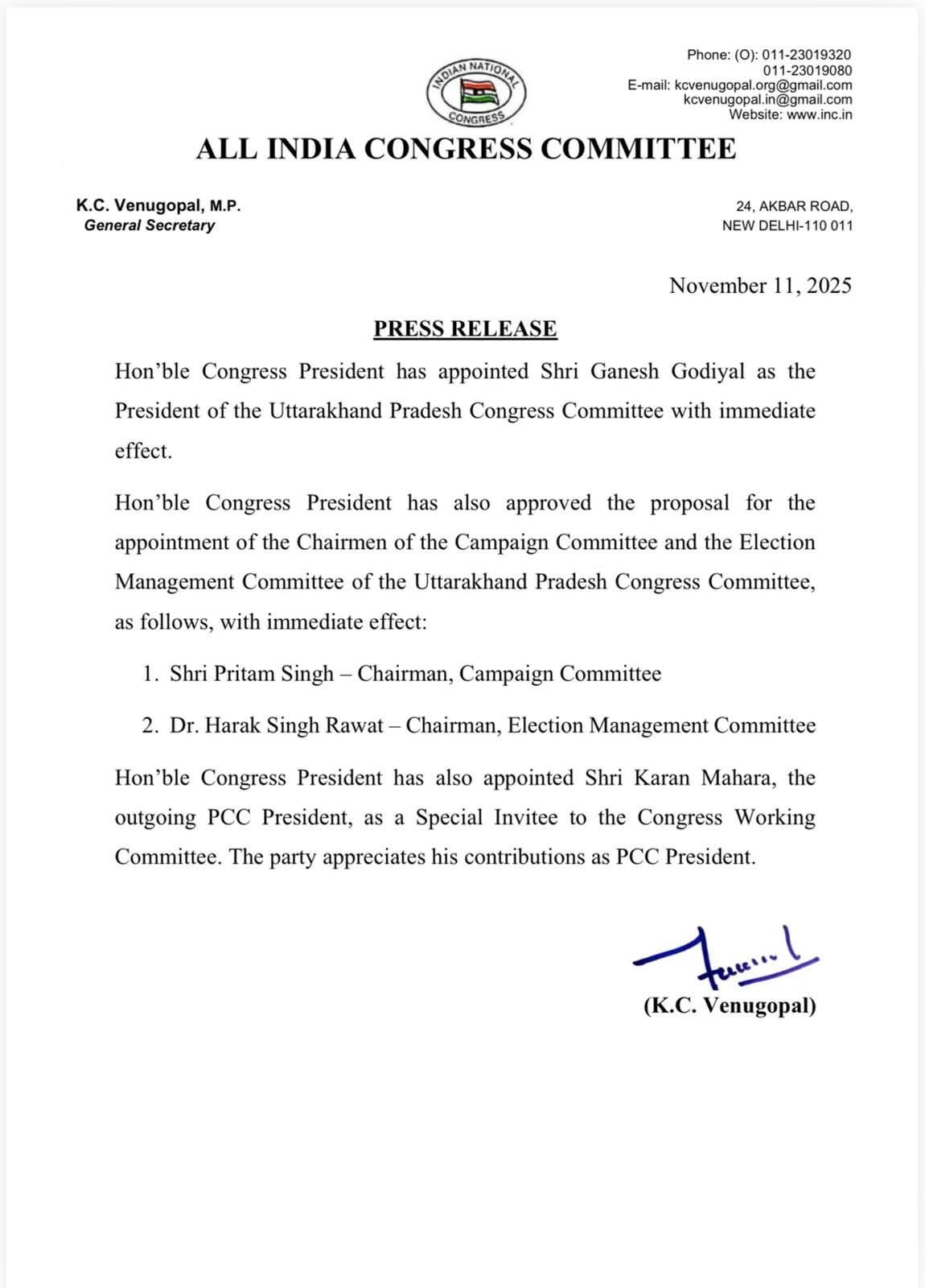 नई दिल्ली/देहरादून। कांग्रेस हाईकमान ने उत्तराखंड संगठन में बड़ा बदलाव करते हुए गणेश गोडियाल को उत्तराखंड प्रदेश कांग्रेस कमेटी का नया अध्यक्ष नियुक्त कर दिया है। अखिल भारतीय कांग्रेस कमेटी के महासचिव के.सी. वेणुगोपाल की ओर से जारी प्रेस विज्ञप्ति के अनुसार यह नियुक्ति तत्काल प्रभाव से लागू हो गई है। पार्टी ने प्रदेश में चुनावी रणनीति को मजबूत करने के लिए दो अहम समितियों के अध्यक्ष भी घोषित कर दिए। प्रीतम सिंह को कैंपेन कमेटी का चेयरमैन नियुक्त किया गया है, जबकि डॉ. हरक सिंह रावत को इलेक्शन मैनेजमेंट कमेटी की जिम्मेदारी सौंपी गई है।