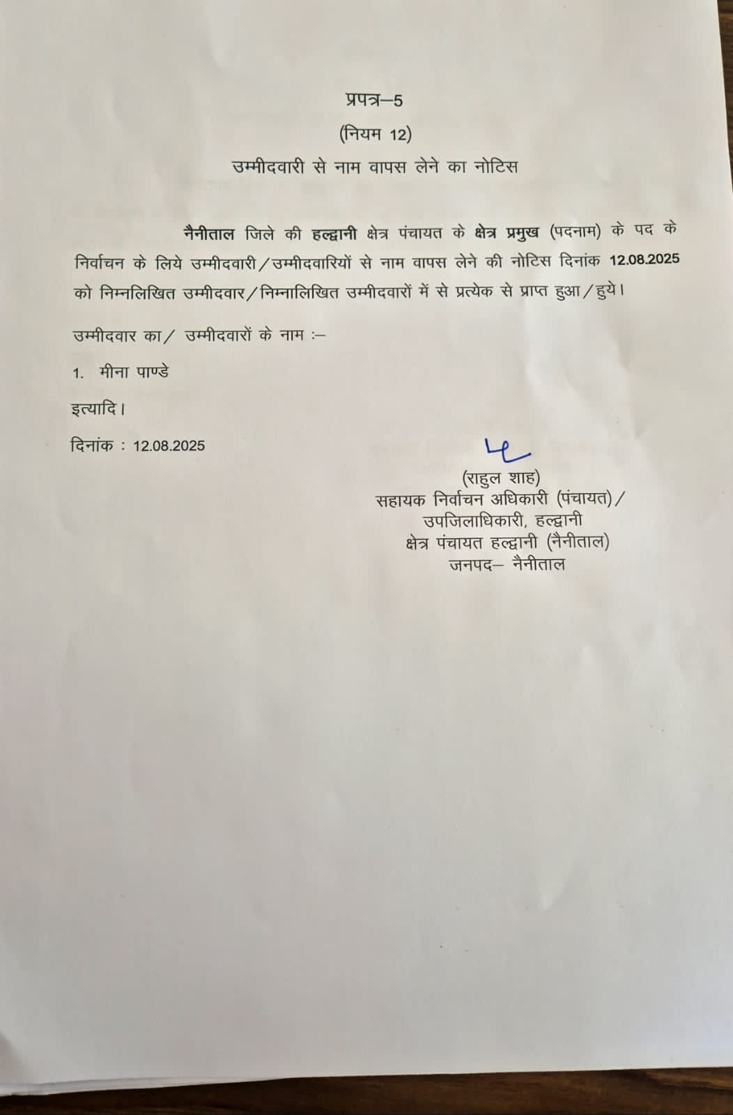 हल्द्वानी। नैनीताल जिले की हल्द्वानी क्षेत्र पंचायत में प्रमुख पद के लिए चुनावी मुकाबला तय होने से पहले ही खत्म हो गया। नामांकन वापसी की अंतिम तिथि पर मीना पांडे ने अपनी उम्मीदवारी वापस ले ली, जिसके बाद मंजू देवी निर्विरोध प्रमुख निर्वाचित घोषित कर दी गईं। सहायक निर्वाचन अधिकारी (पंचायत) एवं उपजिलाधिकारी हल्द्वानी राहुल शाह ने बताया कि 12 अगस्त को नाम वापसी के लिए प्राप्त नोटिस के अनुसार, एकमात्र प्रतिद्वंद्वी मीना पांडे के हटने से चुनाव प्रक्रिया औपचारिक रूप से समाप्त हो गई।