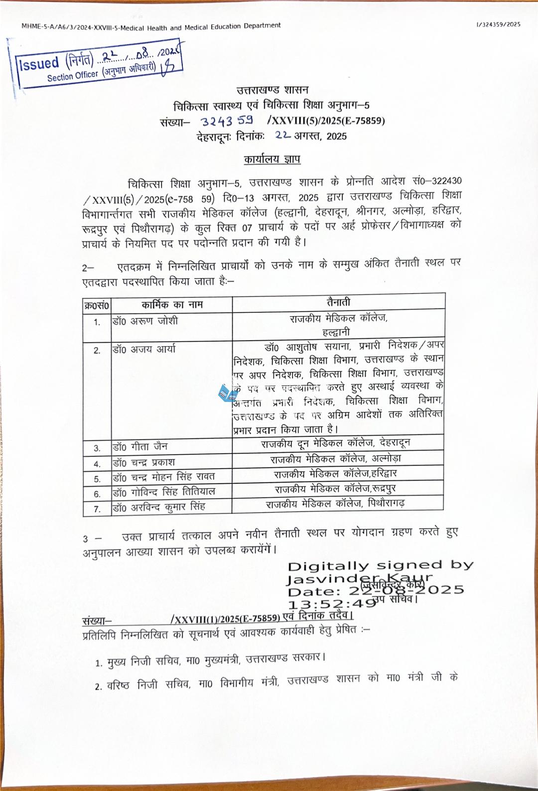 जारी आदेश में डॉ. अरुण जोशी को राजकीय मेडिकल कॉलेज हल्द्वानी, डॉ. अजय आर्या को प्रभारी निदेशक, का अतिरिक्त प्रभार के रूप में चिकित्सा शिक्षा विभाग, डॉ. गीता जैन को दून मेडिकल कॉलेज देहरादून, डॉ. चंद्र प्रकाश को राजकीय मेडिकल कॉलेज अल्मोड़ा, डॉ. चंद्र मोहन सिंह रावत राजकीय मेडिकल कॉलेज हरिद्वार, डॉ. गोविंद सिंह तितियाल को राजकीय मेडिकल कॉलेज रुद्रपुर, और डॉ. अरविंद कुमार सिंह को राजकीय मेडिकल कॉलेज पिथौरागढ़ में पदस्थापित किया गया है।