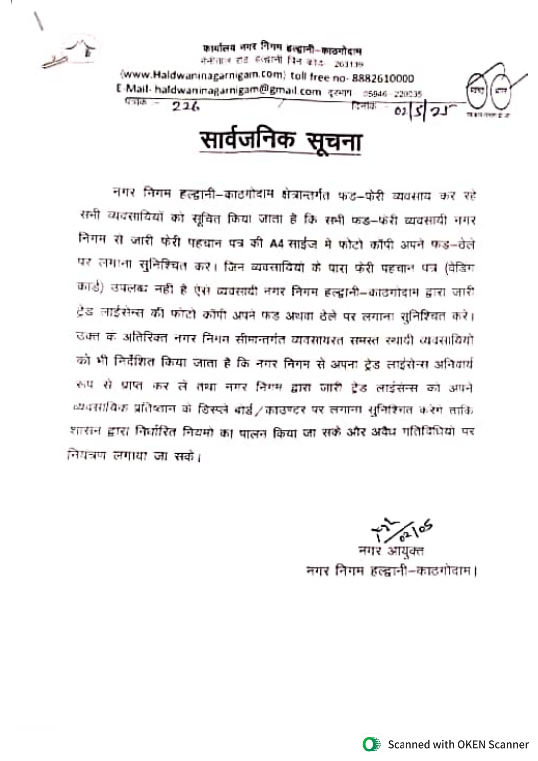हल्द्वानी। नगर निगम हल्द्वानी-काठगोदाम ने फड़-फेरी करने वाले अस्थायी और स्थायी व्यापारियों के लिए नई सख्त गाइडलाइन जारी की है। नगर आयुक्त ऋचा सिंह की ओर से जारी सार्वजनिक सूचना के अनुसार, अब हर फेरी व्यवसायी को नगर निगम से प्राप्त फेरी पहचान पत्र की A4 साइज़ में फोटो कॉपी अपने फड़ या ठेले पर स्पष्ट रूप से लगानी अनिवार्य होगी। ऐसे व्यवसायी जिनके पास फेरी पहचान पत्र (वेंडिंग कार्ड) नहीं है, उन्हें नगर निगम द्वारा जारी ट्रेड लाइसेंस की फोटो कॉपी अपने फड़ या ठेले पर लगानी होगी।