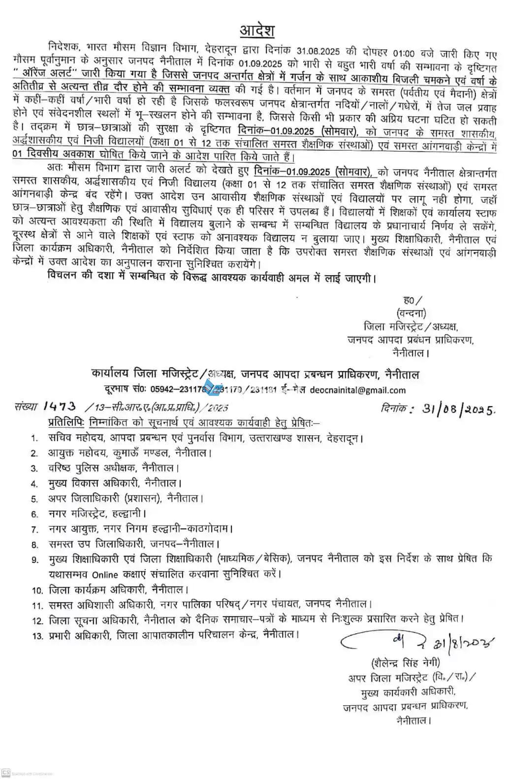 नैनीताल। भारत मौसम विज्ञान विभाग, देहरादून द्वारा 31 अगस्त को जारी पूर्वानुमान में 1 सितंबर को नैनीताल जनपद में भारी से बहुत भारी वर्षा की चेतावनी दी गई है। मौसम विभाग ने स्पष्ट किया है कि गर्जन के साथ आकाशीय बिजली गिरने और वर्षा के अतितीव्र दौर की पूरी संभावना है। इस अलर्ट के मद्देनज़र जिला प्रशासन ने एहतियातन बड़ा निर्णय लेते हुए जनपद के सभी शासकीय, अर्द्धशासकीय और निजी विद्यालयों (कक्षा 1 से 12 तक) और आंगनबाड़ी केंद्रों में एक दिन का अवकाश घोषित कर दिया है। जिला मजिस्ट्रेट वंदना की ओर से जारी आदेश में कहा गया है कि पर्वतीय और मैदानी दोनों ही क्षेत्रों में लगातार हो रही बारिश से नदियों, नालों और गधेरों में तेज जल प्रवाह और संवेदनशील स्थानों पर भूस्खलन की आशंका बनी हुई है।