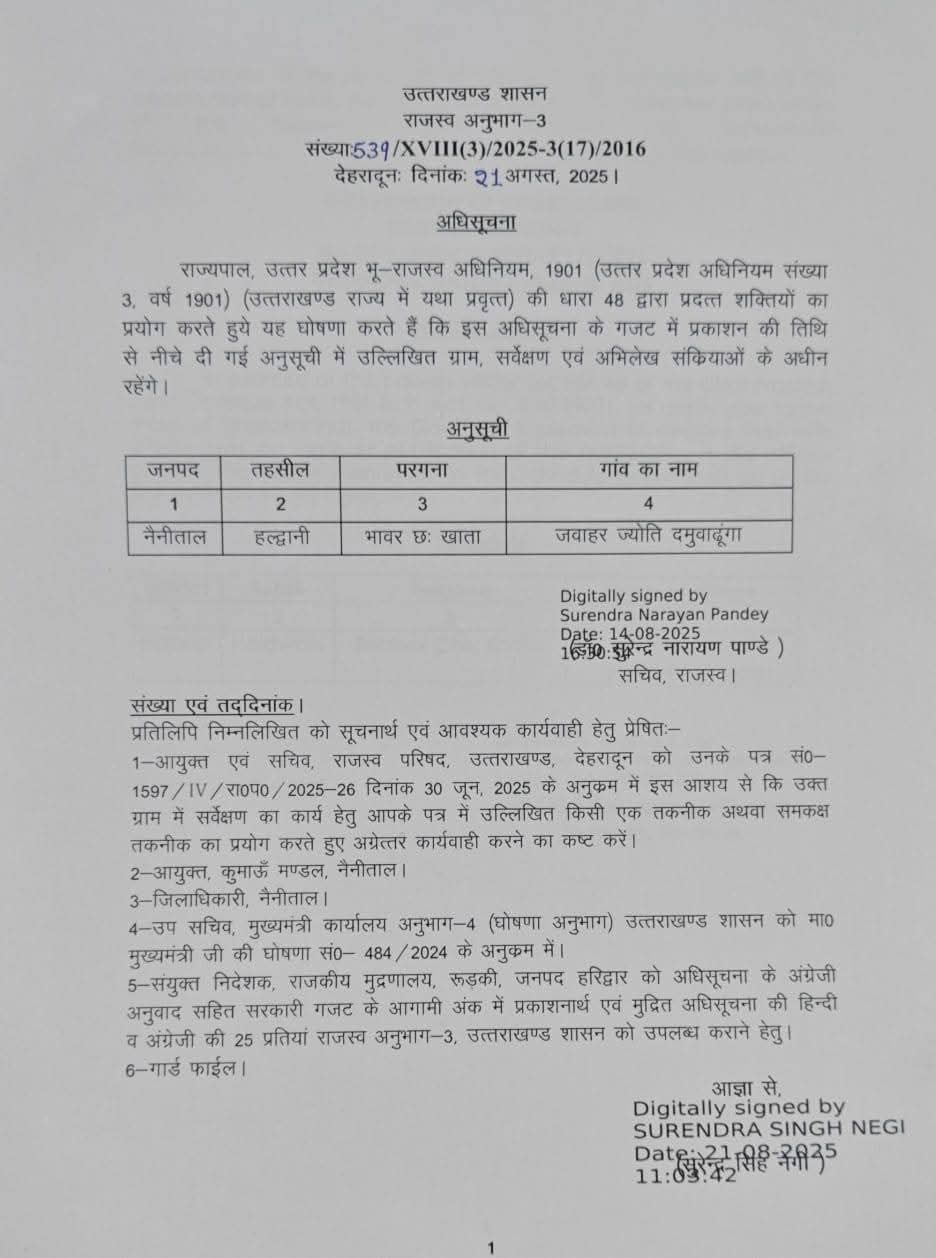 हल्द्वानी। लंबे इंतजार के बाद ग्राम जवाहर ज्योति, दमुवाढूंगा में भूमि रिकॉर्ड ऑपरेशन की प्रक्रिया एक बार फिर से शुरू होने जा रही है। उत्तराखंड सरकार ने मुख्यमंत्री पुष्कर सिंह धामी के निर्देशन में 21 अगस्त 2025 को उत्तर प्रदेश भू-राजस्व अधिनियम, 1901 की धारा-48 के अंतर्गत अधिसूचना जारी कर इस कार्य को आधिकारिक मंजूरी दे दी है। इससे ग्रामीणों को न केवल भूमि स्वामित्व के कानूनी अधिकार मिलेंगे बल्कि शासकीय योजनाओं के लिए भूमि का बेहतर उपयोग भी संभव हो सकेगा। पूर्व में यह कार्य अधिक जनसंख्या और पारंपरिक चैन पद्धति से सर्वेक्षण की जटिलताओं के कारण रोक दिया गया था। लेकिन अब सरकार ने आधुनिक तकनीक की मदद से इस मिशन को पूरा करने का निर्णय लिया है।