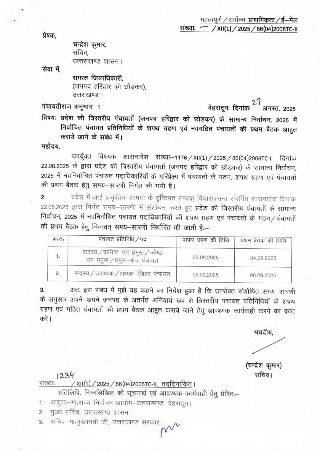देहरादून। प्रदेश में हाल ही में आई प्राकृतिक आपदा के कारण स्थगित हुई त्रिस्तरीय पंचायतों (जनपद हरिद्वार को छोड़कर) के नवनिर्वाचित प्रतिनिधियों के शपथ ग्रहण और नवगठित पंचायतों की प्रथम बैठक की नई तिथि घोषित कर दी गई है। पंचायतीराज अनुभाग-1 की ओर से शुक्रवार को जारी संशोधित शासनादेश में जिलाधिकारियों को स्पष्ट निर्देश दिए गए हैं कि निर्धारित तिथियों के अनुसार सभी नवनिर्वाचित पंचायत प्रतिनिधियों का शपथ ग्रहण और प्रथम बैठक समय पर संपन्न कराई जाए।