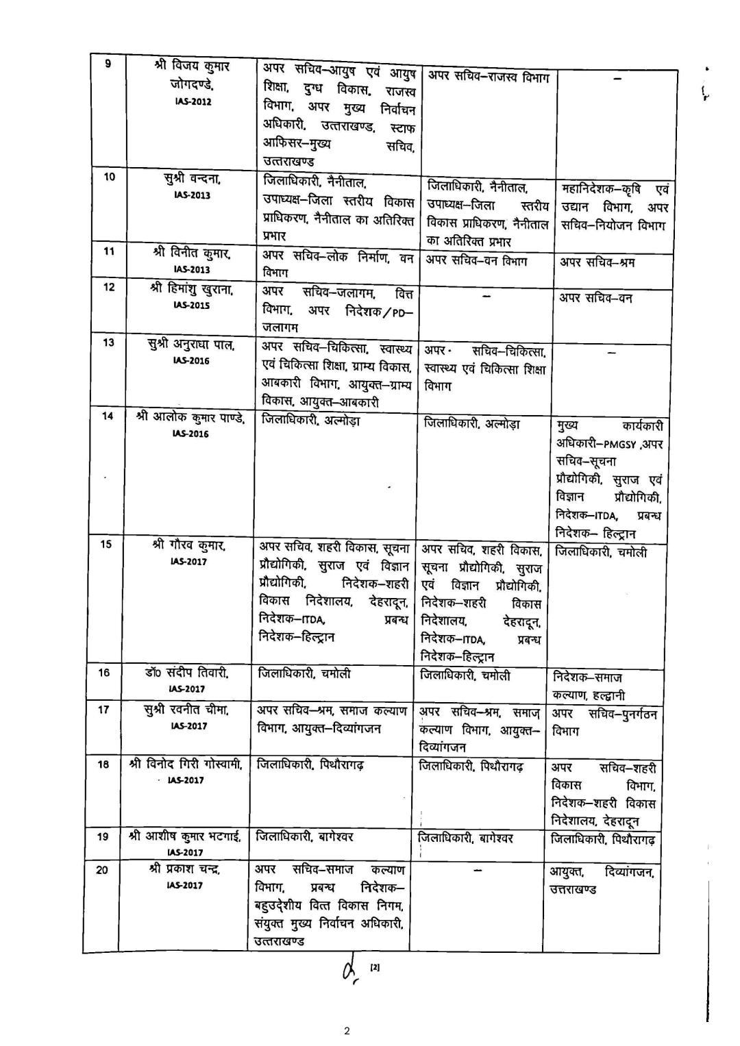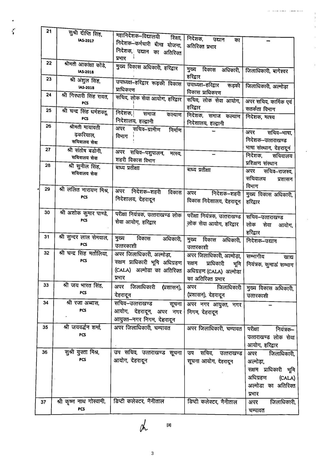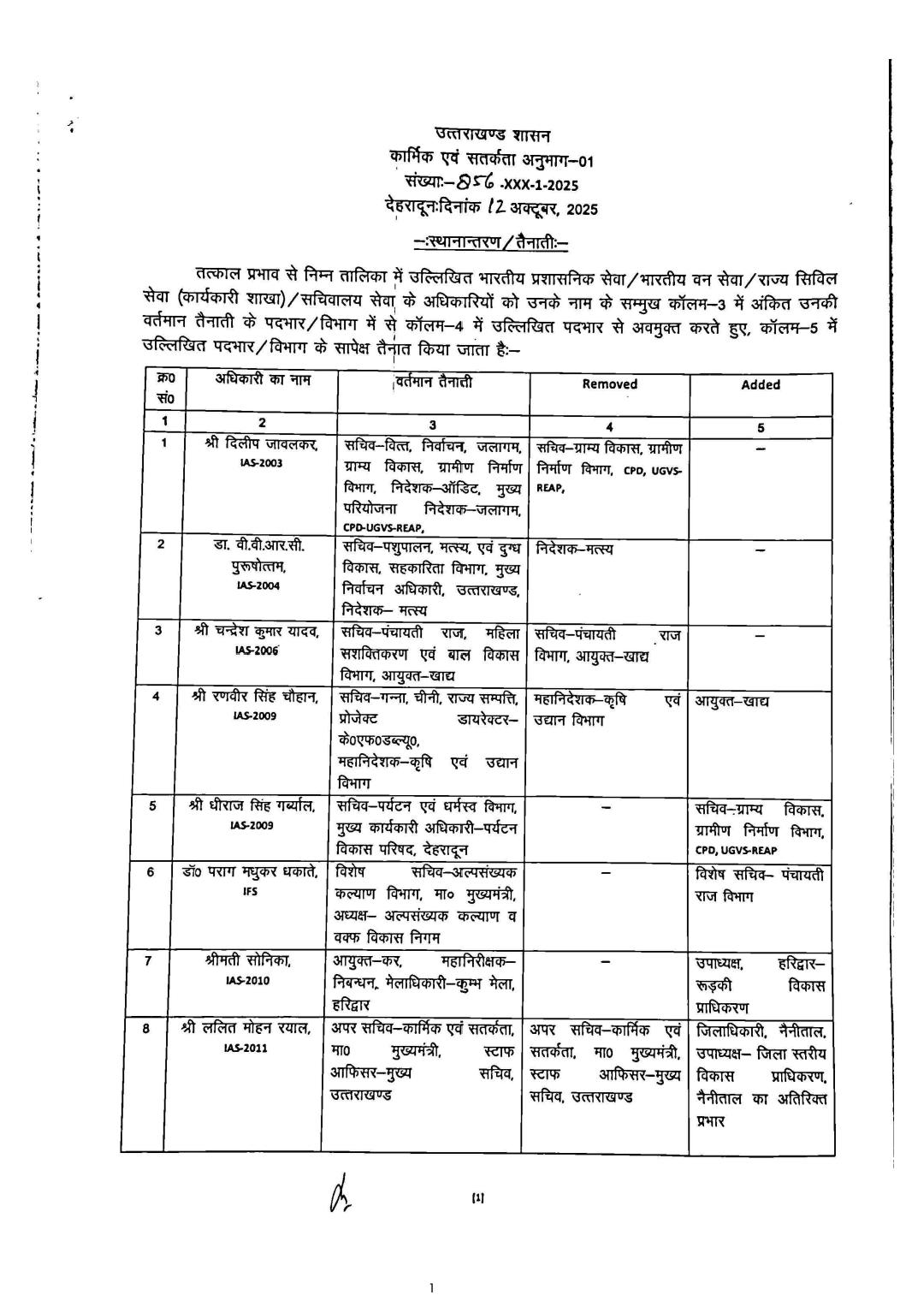 देहरादून। उत्तराखंड शासन ने प्रशासनिक स्तर पर बड़ा फेरबदल करते हुए कई वरिष्ठ अधिकारियों के तबादले किए हैं। कार्मिक एवं सतर्कता अनुभाग-01 द्वारा जारी आदेश संख्या 856-XXX-1-2025 के तहत भारतीय प्रशासनिक सेवा (IAS), भारतीय वन सेवा (IFS), राज्य सिविल सेवा (PCS) और सचिवालय सेवा के अधिकारियों को तत्काल प्रभाव से नई तैनाती दी गई है।
