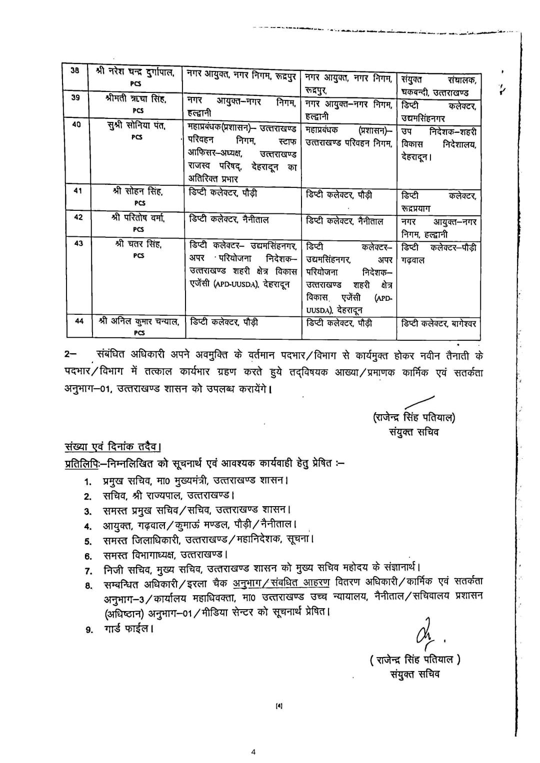 जारी आदेश के अनुसार, अधिकारियों को उनके वर्तमान विभागों से कार्यमुक्त करते हुए नई तैनाती के पदभार ग्रहण करने के निर्देश दिए गए हैं। सभी अधिकारी अपने नए पदों पर कार्यभार संभालने के बाद इसकी रिपोर्ट शासन को उपलब्ध कराएंगे। आदेश पर संयुक्त सचिव राजेन्द्र सिंह पतियाल के हस्ताक्षर हैं।