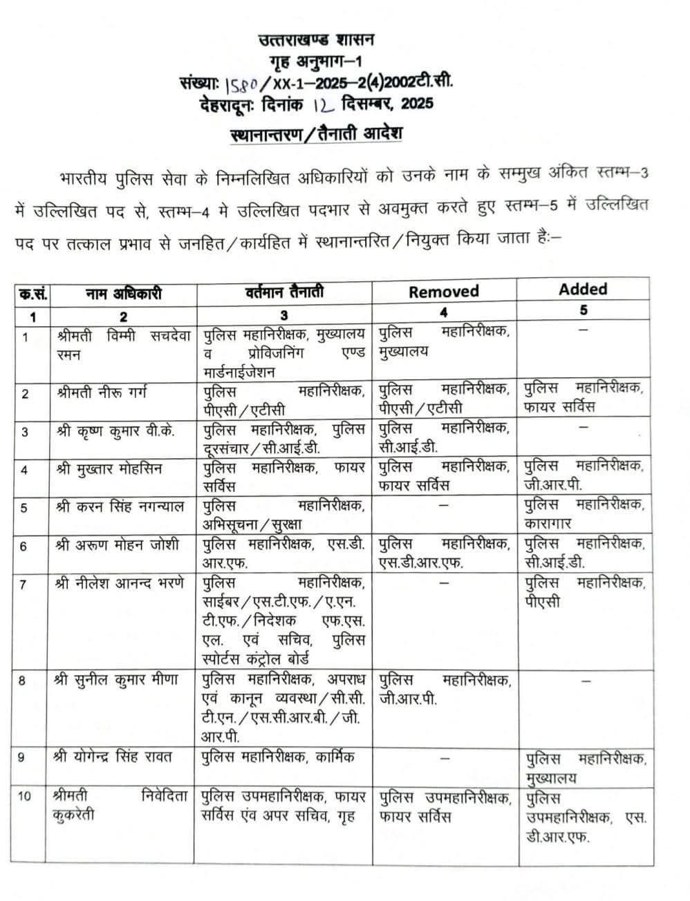 देहरादून। राज्य में प्रशासनिक फेरबदल के तहत उत्तराखंड शासन ने शुक्रवार को भारतीय पुलिस सेवा (IPS) के अधिकारियों के स्थानांतरण और नई तैनाती के आदेश जारी किए। गृह अनुभाग-1 द्वारा जारी आदेश संख्या 1580/XX-1-2025 में जनहित एवं कार्यहित में कई महत्वपूर्ण पदों पर बदलाव करते हुए अधिकारियों को उनके वर्तमान पद से अवमुक्त कर नई जिम्मेदारियां सौंपी गई हैं। आदेश तत्काल प्रभाव से लागू कर दिए गए हैं।